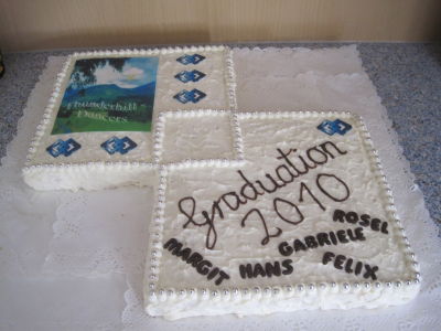 Danach tauchte aus dem Nichts eine Torte anläßlich unserer Graduation auf, sponsored by Rita and Leroy. Danke! Die Torte durften wir verteilen, das Buffet wurde eröffnet und der erste Schritt zu einer weltweiten Familie, zu der wir nun gehören, war getan.