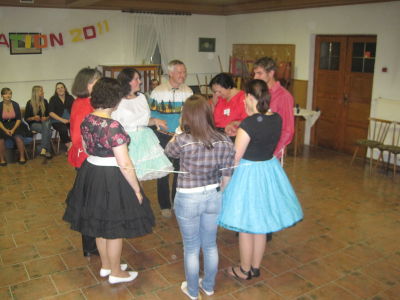 Auch einige Gäste anderer Clubs waren an diesem Abend anwesend, was uns zwar freute, die Aufregung aber auch noch erhöhte, denn wir wollten uns ja nicht noch vor Fremden vielleicht blamieren. Aber zuerst wurde der Abend wie jeder normale Clubabend mit einem Tip gestartet, was uns ein wenig die Anspannung nahm. Doch sofort nach der ersten Runde hieß es "Antreten zur praktischen Prüfung". Hilfe, ich war noch gar nicht soweit. Aber es half nichts, wir mussten antreten und einen "besonderen" Tip tanzen, markiert mit roten und blauen Bändern um die rechten und linken Handgelenke. Die Ansagen lauteten also nicht right and left, sondern red and blue. Mehr als ein Blick schielte immer wieder auf die bunten Bändchen, aber irgendwie brachten wir die Runde hinter uns und die praktische Prüfung wurde als bestanden erklärt. Na dann, war doch gar nicht so schwer!