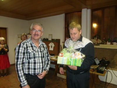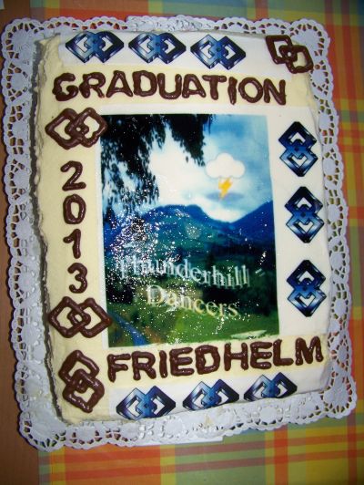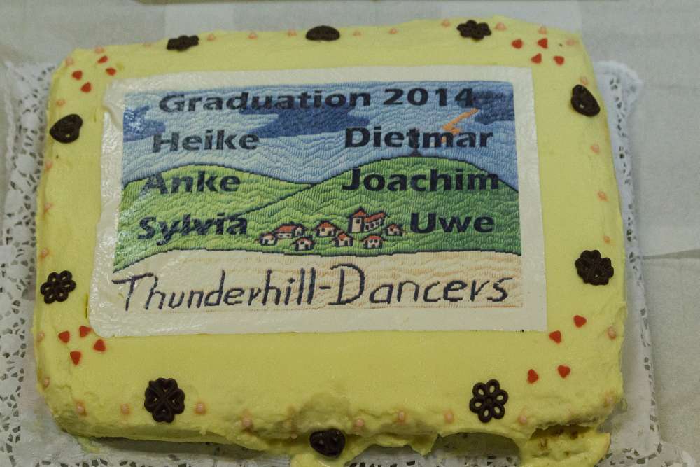 Nun aber hieß es, höchste Konzentration und ab in den Seitenraum, wo wir unsere "extrem schwierige" theoretische Prüfung absolvieren mussten. Aber, uns konnte nichts erschüttern und so meisterten wir auch diese Hürde. Nach Auswertung der Prüfungsergebnisse wurden wir zur Bühne gerufen und uns feierlich unsere Diplome überreicht. Wir haben es geschafft, nun sind wir tatsächlich keine Students mehr und die große weite Square Dance Welt steht uns offen! Danach gab es eine wunderschöne Zeremonie, die uns die 4 Ecken des Square Dance (Freundlichkeit, Pflicht, Demokratie und Vergnügen) nahebrachte und sicher jedem eine Gänsehaut verursachte. Die Krönung dieser Zeremonie war eine tolle und sehr leckere Torte mit dem Thunderhill Logo und unseren Namen, die wir an alle Anwesenden verteilten. Danach konnten wir endlich alle entspannt und erleichtert das große Buffet stürmen und die letzte Anspannung beim Schlemmen verlieren. Nach dem Essen gab es noch einen Tipp, dann waren wir Students dran, bzw. unser Caller Philipp Aff, der nun seinem Callerstreich ausgesetzt wurde. Nach einer kurzen Rede von mir, die ich in Reimform vortrug, musste Philipp sich umziehen und später selbst tanzen. Doch zuvor verteilten wir Students noch unter verschiedenen Danksagungen Blumen an unsere Präsidentin und kleine Präsente an unsere Angels. Unser Caller bekam einen großen Kaktus zur "Vergeltung" seiner ab und zu ziemlich strengen Stacheligkeit während unserer Class. Dies dann folgende Tanzrunde fand unter erschwerten Bedingungen statt. Philipp musste blind (als girl) mittanzen und seine Mittänzer mussten Luftballons zwischen den Knien balancieren. Der Square meisterte diese Herausforderung aber überraschend gut zur Freude und Begeisterung des Publikums. Nachdem nun auch der Caller seinen "Streich" überstanden hatte klang der Abend mit weiteren Tipps und Plauderein gemütlich aus.